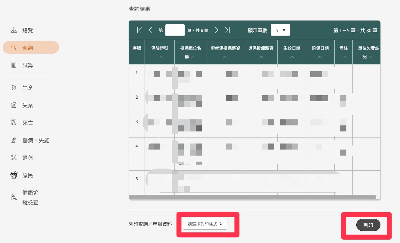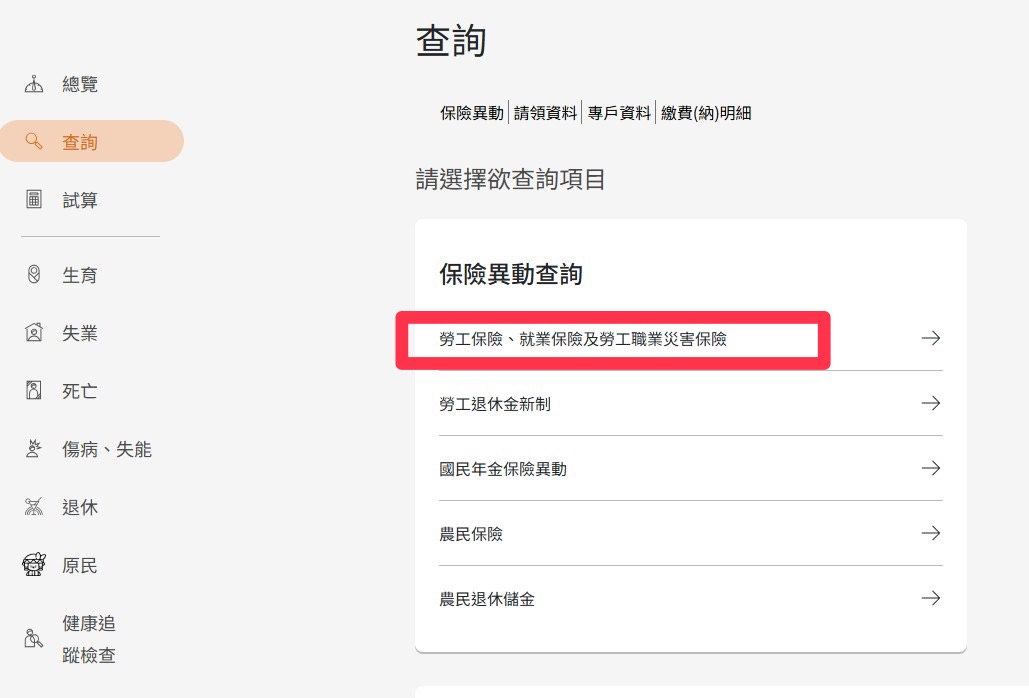 🔍Step3. 左邊欄位點選查詢,選擇勞公保險就業保險及勞工職業災害保險。